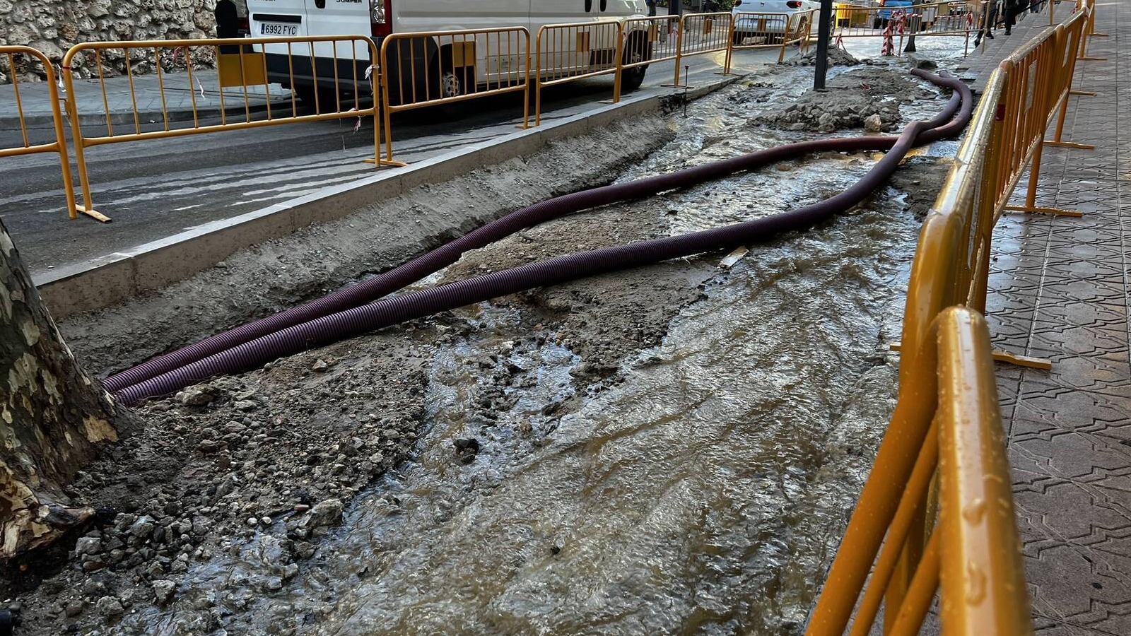 Esta mañana, durante el trascurso de las obras en la calle Hospital, se ha producido la rotura de una tubería de agua.